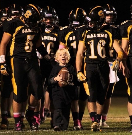 I am writing in response to the Souhegan Saber football team’s game on October 7th that served as a fund-raiser for the Hope for Gus Foundation. It’s nearly impossible to express the feelings I have for my son Gus, who was diagnosed with Duchenne Muscular Dystrophy (DMD), two years ago. DMD is currently considered a terminal illness – it is the worst form of muscular dystrophy. The diagnosis means that Gus will be confined to a wheelchair before his adolescence, and eventually lose his ability to breathe on his own. Boys with DMD typically die of heart failure in their mid-twenties. It is hard to resolve that reality when spending time with six year old Gus today. He is vibrant and alive, full of the sort energy and love of life that only young children can have.